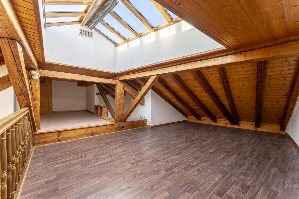 L'appartement se distribue sur un hall d'entrée avec rangements donnant sur le grand espace de vie servant de salon / salle à manger. Celui-ci est surplombé par une magnifique mezzanine ouverte, parfait pour un coin lecture, TV ou études. On trouve également une cuisine séparée, deux chambres et une salle de bain. En annexe, le bien dispose d'une place de parc extérieure (prix en sus), et d'une cave.
