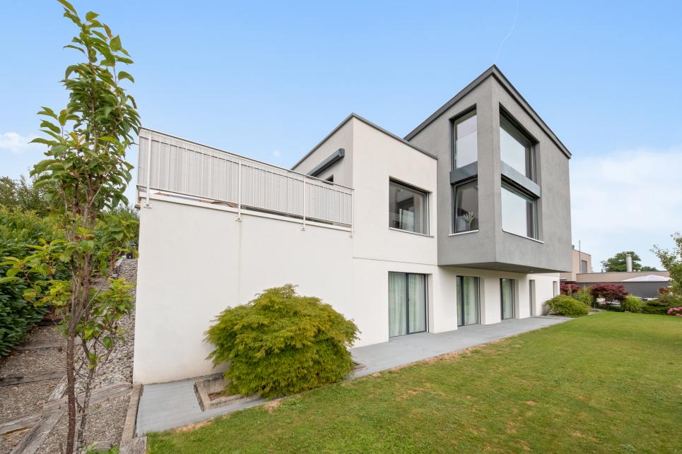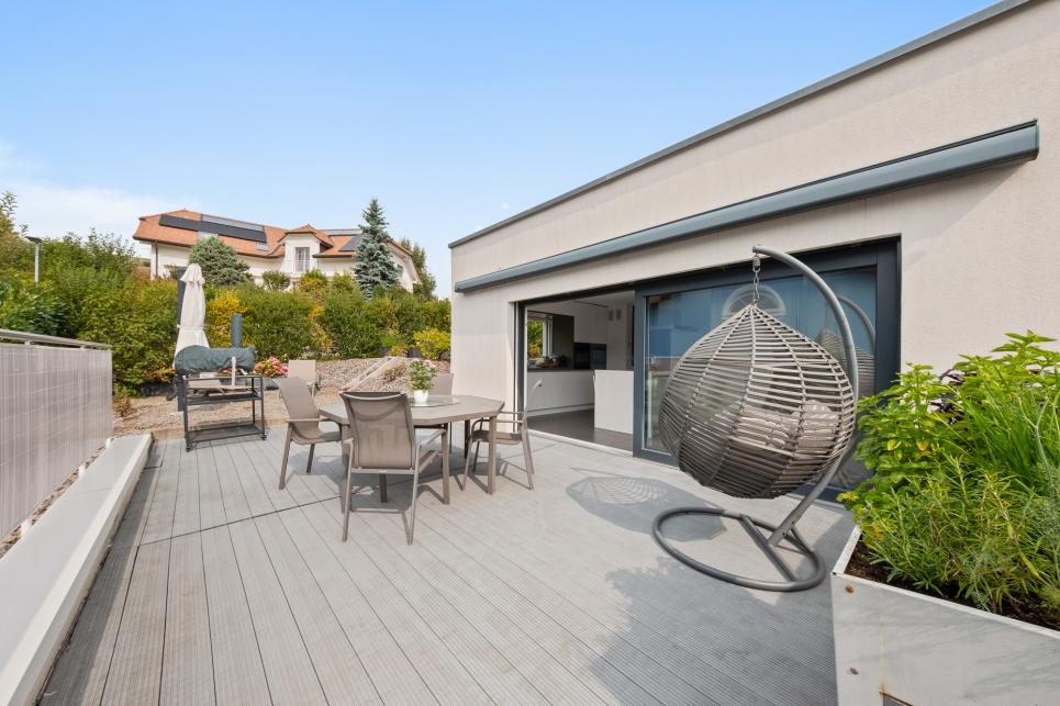 Implantée sur une belle parcelle verdoyante, la villa profite d'un jardin paysager accessible depuis toutes les chambres du niveau inférieur, ainsi que d'une spacieuse terrasse parfaite pour les repas en extérieur et les moments de détente.