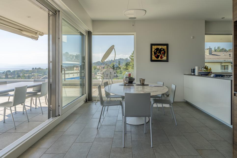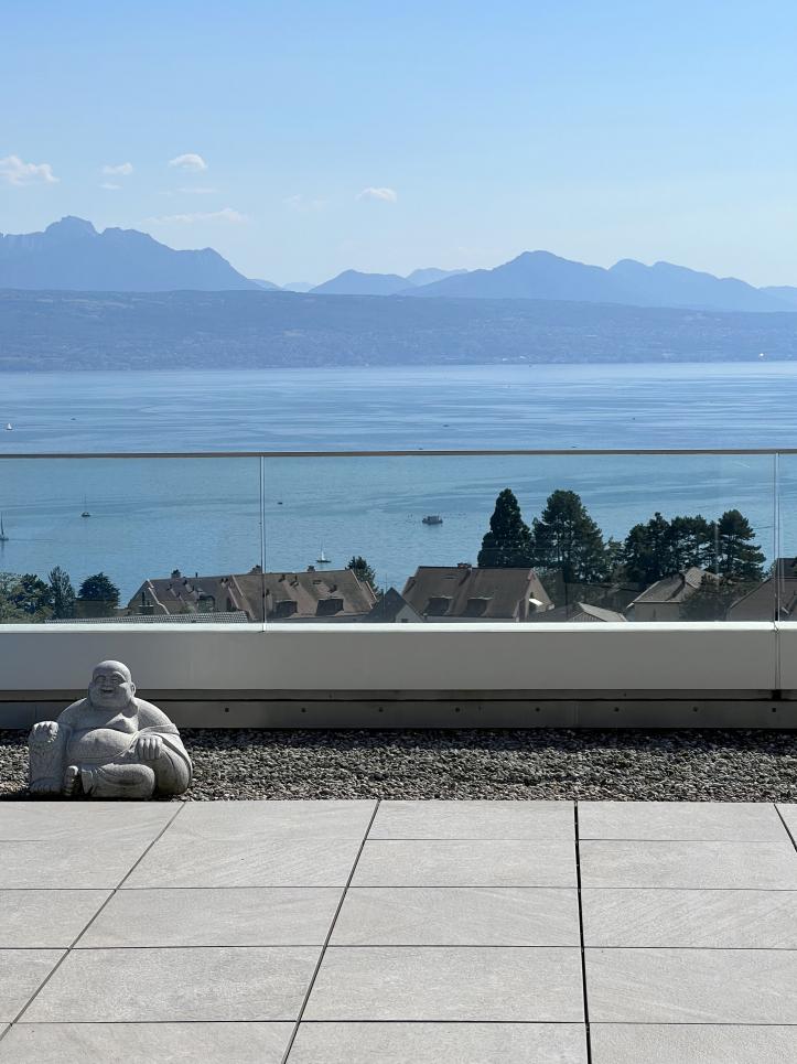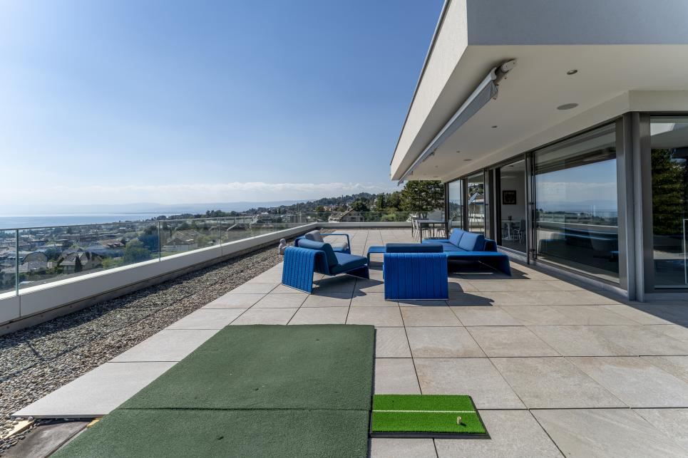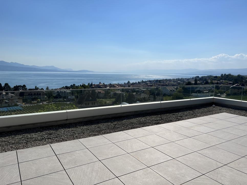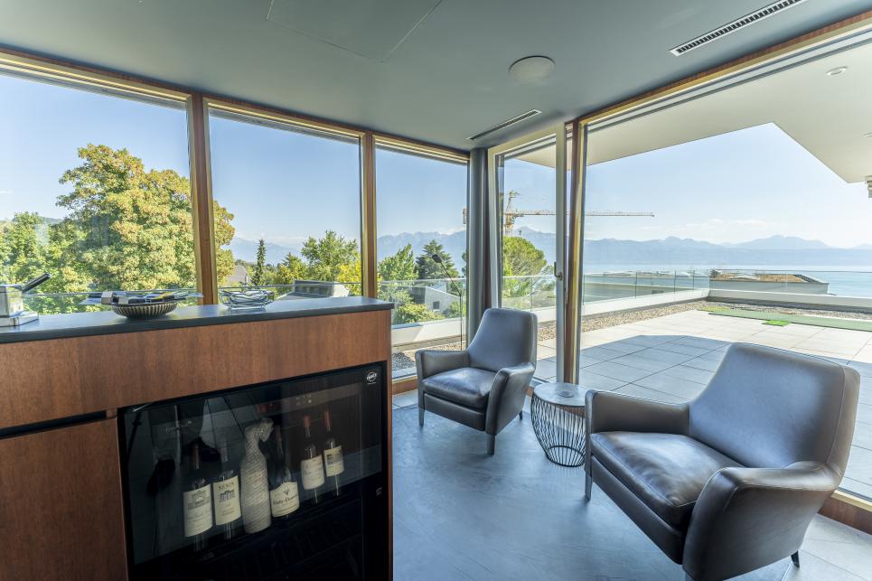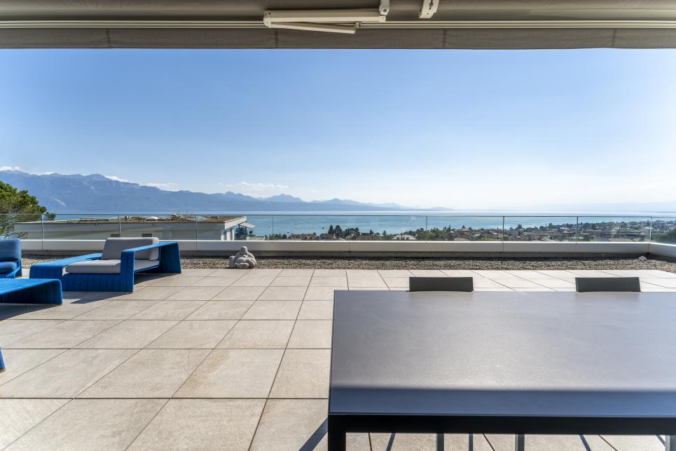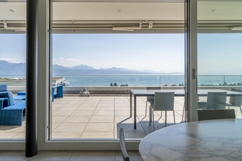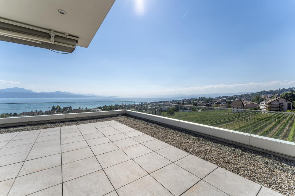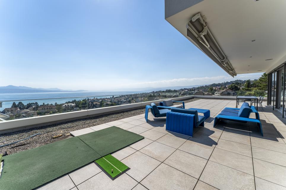 A l'état neuf, ce bien de prestige a été aménagé avec goût dans des finitions et matériaux de haute qualité. Il dispose d'un système domotique permettant de réguler à distance les caméras, l'alarme, le chauffage, les lumières et les stores. Au dernier étage d'un petit immeuble de haut standing et accessible par ascenseur privatif, cet appartement rare à la vente se distribue en duplex et compte quatre spacieuses chambres disposant chacune d'une salle de bains en suite (baignoires, hamman, douches), d'un espace de réception / coin TV, d'une buanderie privée, d'un bureau ouvert pouvant être réaménagé en chambre, d'un fumoir avec caves à vins ainsi que d'une salle à manger / séjour avec cuisine ouverte et accès à une immense terrasse de plus de plus de 200 m2 jouissant d'une vue panoramique sur toute la région et le lac Léman. En annexe, le bien se complète d'une immense cave privative, d'une seconde buanderie, de deux places visiteurs et de trois places de parc privatives (en sus) disposant d'une borne électrique.