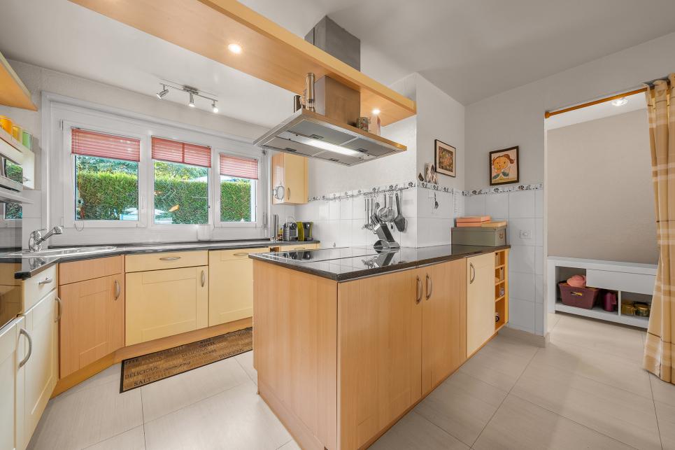 Rez-de-chaussée : vaste séjour avec salle à manger s'ouvrant sur la terrasse et le jardin, cuisine ouverte entièrement équipée, WC visiteurs et hall de distribution.