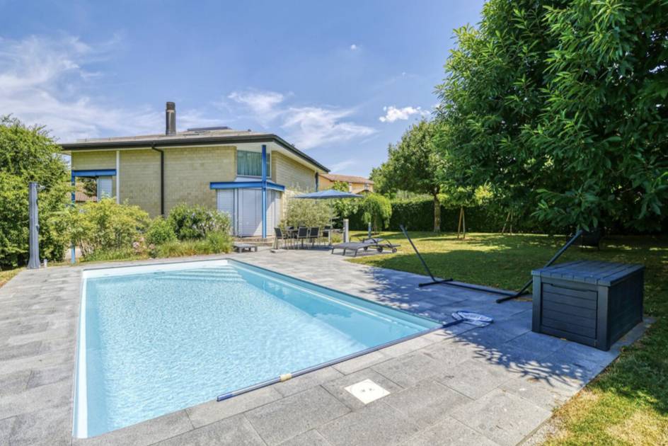Implantée sur une parcelle d'environ 1'200 m², la villa dispose d'un jardin paysager avec piscine chauffée au sel et d'une dépendance aménageable, idéale pour un studio indépendant ou un espace invité. Avec environ 180 m² habitables et 215 m² utiles sur plusieurs niveaux, elle offre 4 chambres et 4 salles de bains, baignée de lumière naturelle.