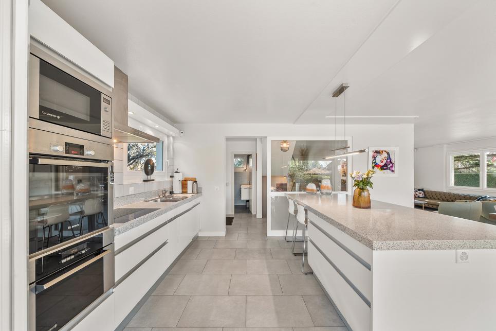 Le rez-de-chaussée se compose d'un salon ouvert sur la salle à manger, avec de larges baies vitrées permettant une vue directe et imprenable sur le jardin et la piscine. La cuisine, ouverte et entièrement équipée, fait également partie de cet espace convivial. Une chambre située au rez-de-chaussée offre un confort supplémentaire.