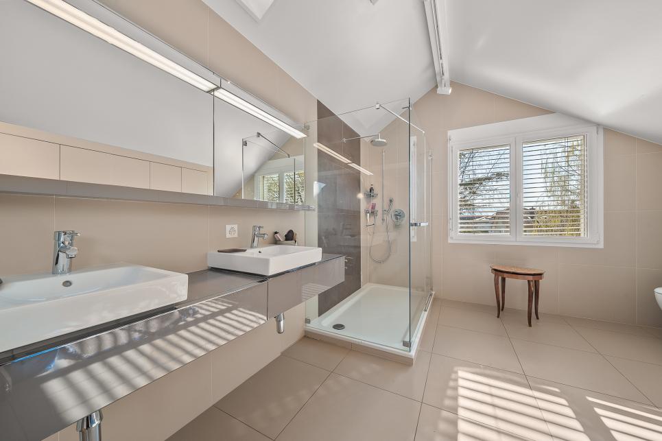 L'étage se compose de deux grandes chambres ainsi qu'une salle de bain moderne et fonctionnelle. La suite parentale est un véritable havre de paix, avec sa propre salle de bain et son dressing pour un confort optimal.