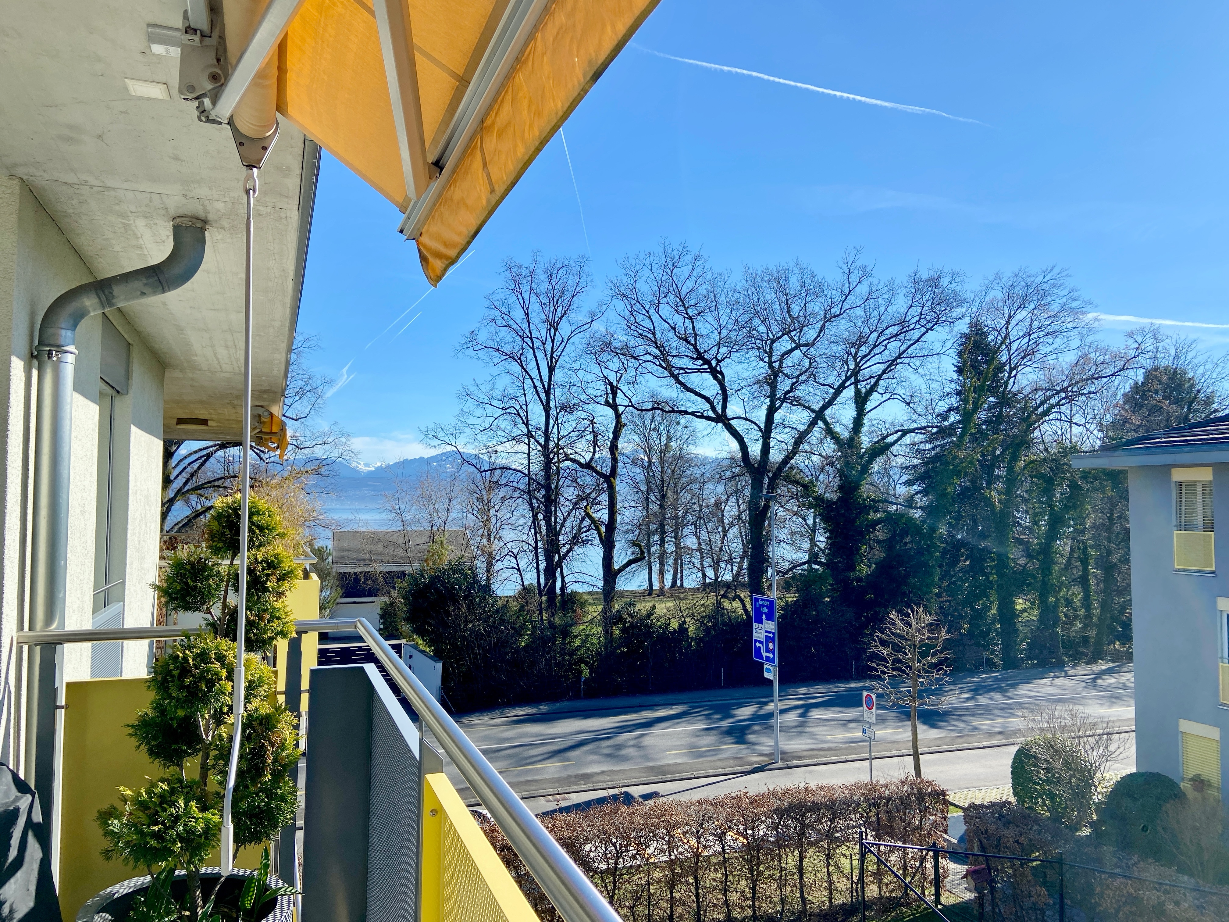 Le grand balcon avec vue sur le lac et les alpes, idéalement orienté, constitue un véritable prolongement des pièces de vie et invite à profiter de belles soirées d’été dans une atmosphère paisible.