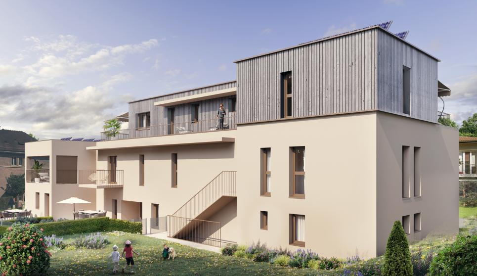 Chaque lot jouira de généreux balcons-terrasses. La production de chaleur est effectuée par une pompe à chaleur ainsi que des panneaux solaires et est distribuée par chauffage au sol, le bâtiment répond aux normes Minergie.