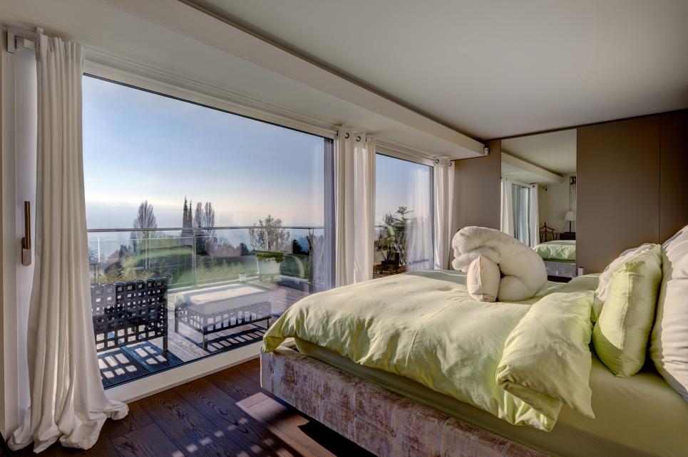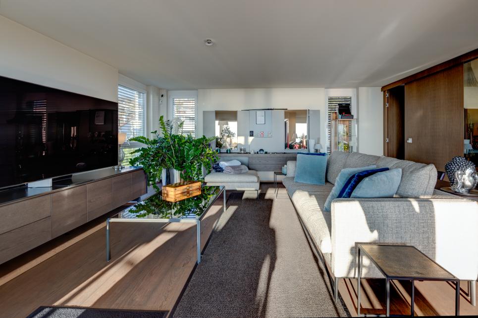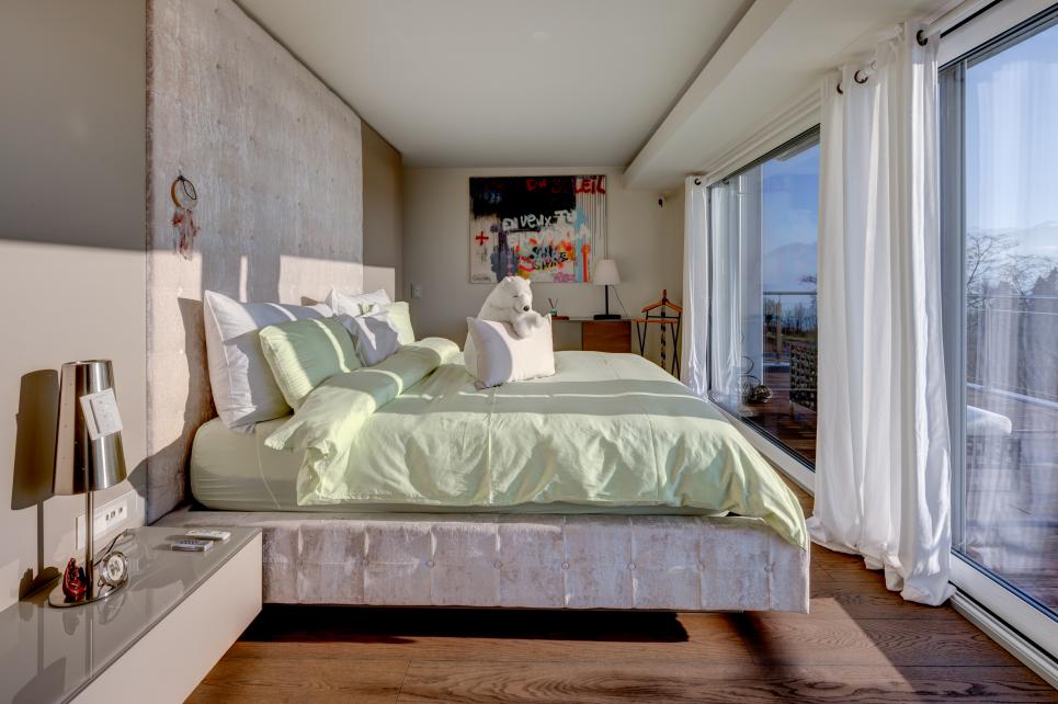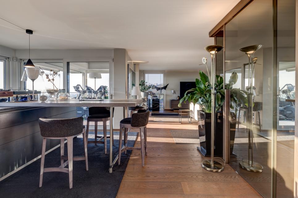 Dès l'entrée, le ton est donné : volumes généreux, finitions haut de gamme et matériaux choisis avec soin. La pièce à vivre, baignée de lumière, s'ouvre sur une vaste terrasse de plus de 100 m² offrant un panorama à couper le souffle sur le lac et les Alpes. La cuisine ouverte, contemporaine et entièrement équipée, s'intègre parfaitement dans cet espace convivial.