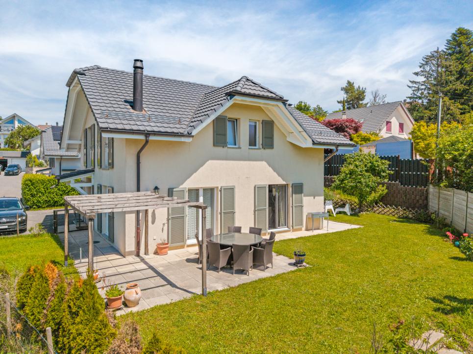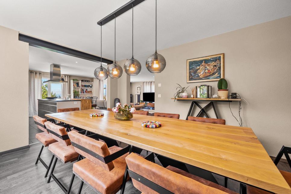 Avec une surface utile de 243 m², la maison comprend, au rez-de-chaussée, un grand et lumineux séjour avec poêle, une cuisine entièrement équipée ouverte sur le séjour et la salle à manger, ainsi qu'un WC visiteurs et un vestiaire. (Possibilité de créer une chambre supplémentaire à cet étage.) Vous profiterez également d'un grand jardin de 600 m² et d'une terrasse accessible depuis le salon et la cuisine, parfait pour les moments en plein air.