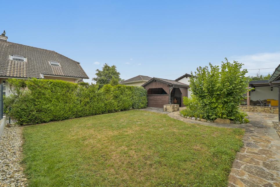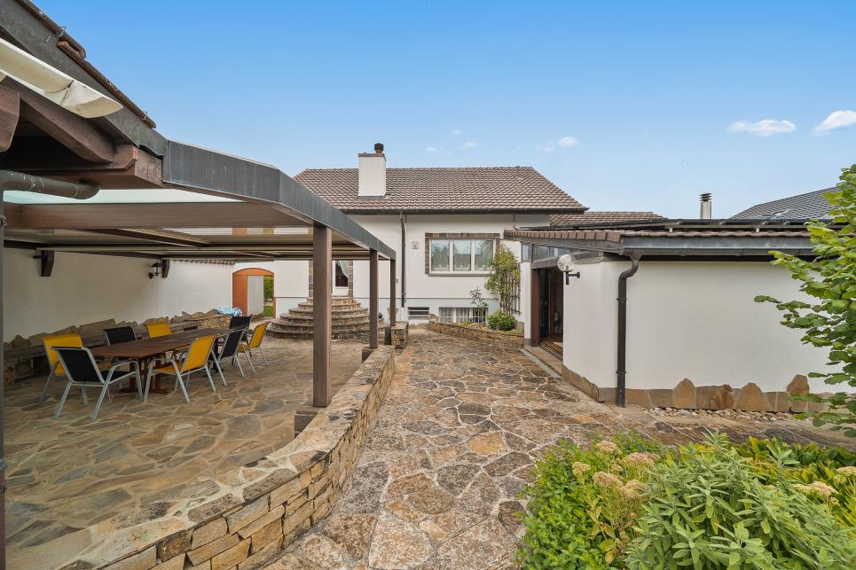 L'extérieur a été pensé pour favoriser la détente et la convivialité.?Une grande terrasse et une pergola viennent compléter l'espace de vie.?Un double garage ainsi que des places de parc extérieures sont également à disposition.
