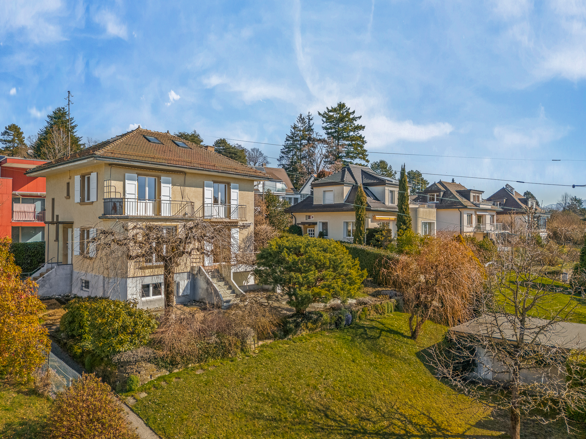 À l’extérieur, un vaste jardin arboré, richement végétalisé et soigneusement entretenu, entoure la propriété et garantit intimité et quiétude. Les balcons des étages supérieurs permettent de profiter pleinement d’une vue dégagée sur le lac Léman et les reliefs alpins, dans un environnement résidentiel d’un calme absolu.