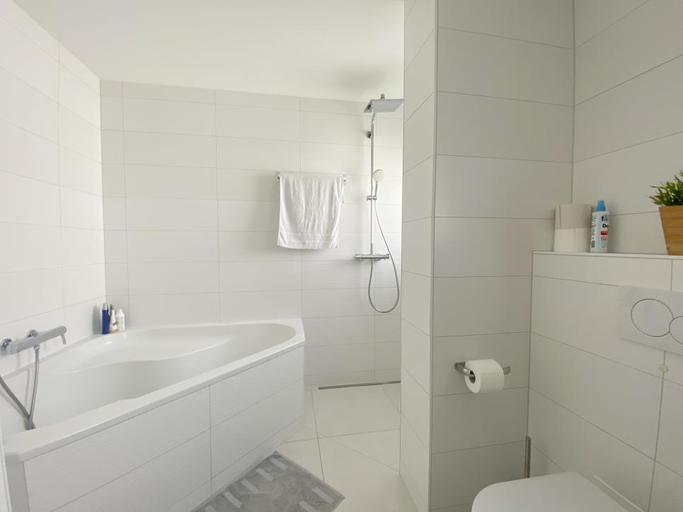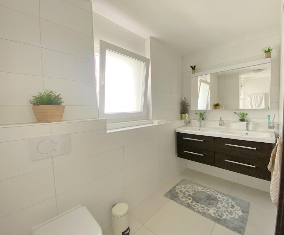- Salle de bain XXL avec baignoire d'angle, douche et double vasque