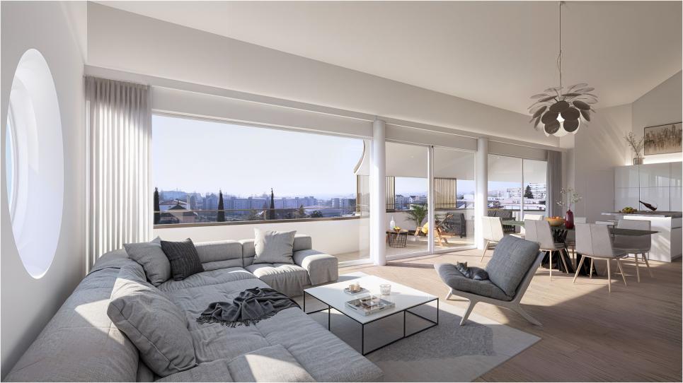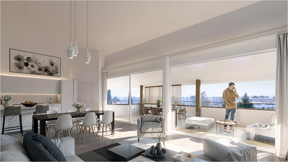 Répondant aux normes énergétiques les plus exigeantes (label MINERGIE-P), ce projet s'inscrit pleinement dans une démarche durable. Tous les appartements sont traversants : les chambres sont orientées au nord, à l'ombre et au frais, protégées par la végétation existante, tandis que les pièces à vivre, orientées plein sud, bénéficient de vastes baies vitrées ouvrant sur de généreux balcons et terrasses. Ces espaces extérieurs, partiellement couverts et équipés de brise-soleil amovibles, offrent un confort optimal en toute saison, tout en valorisant la vue panoramique.