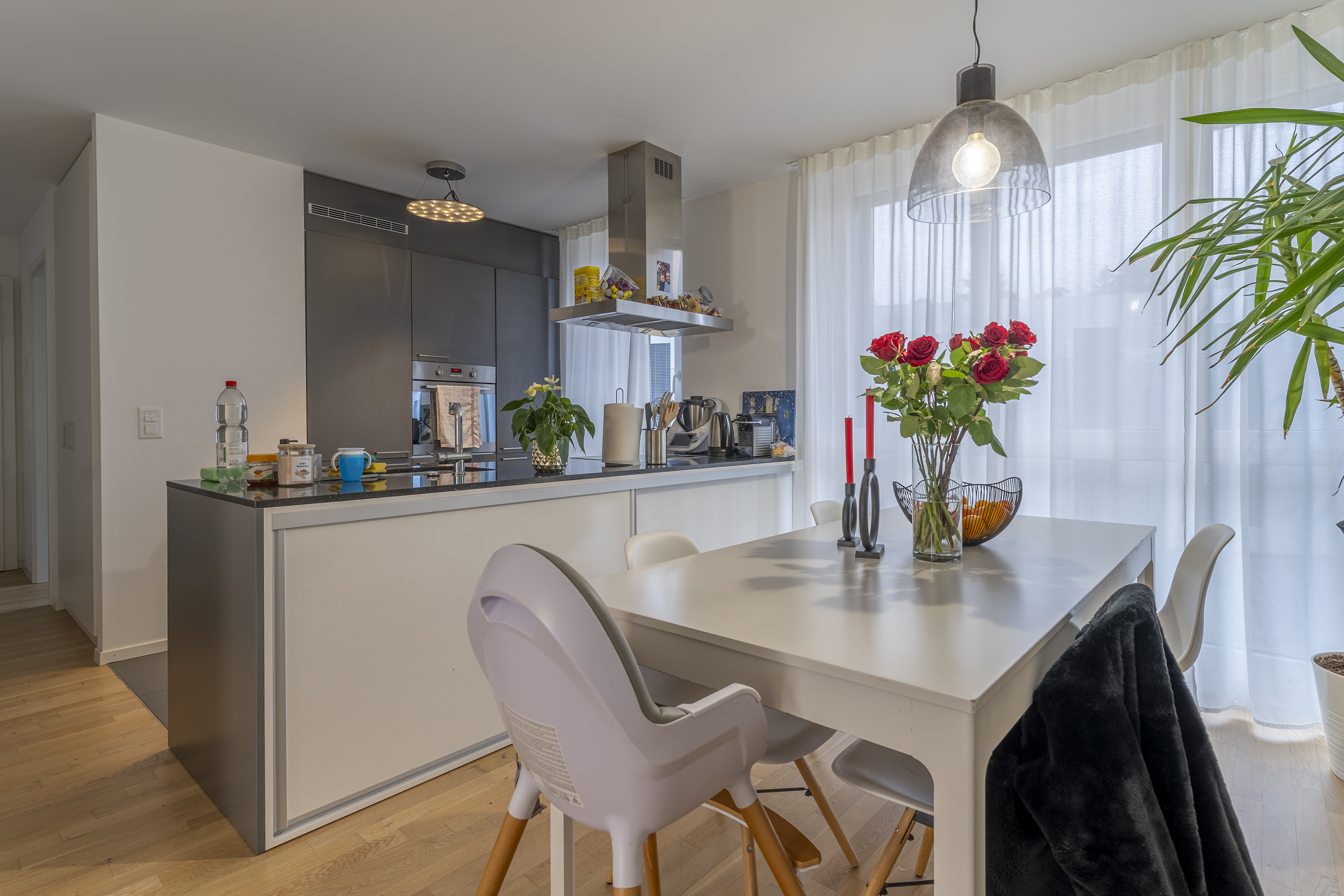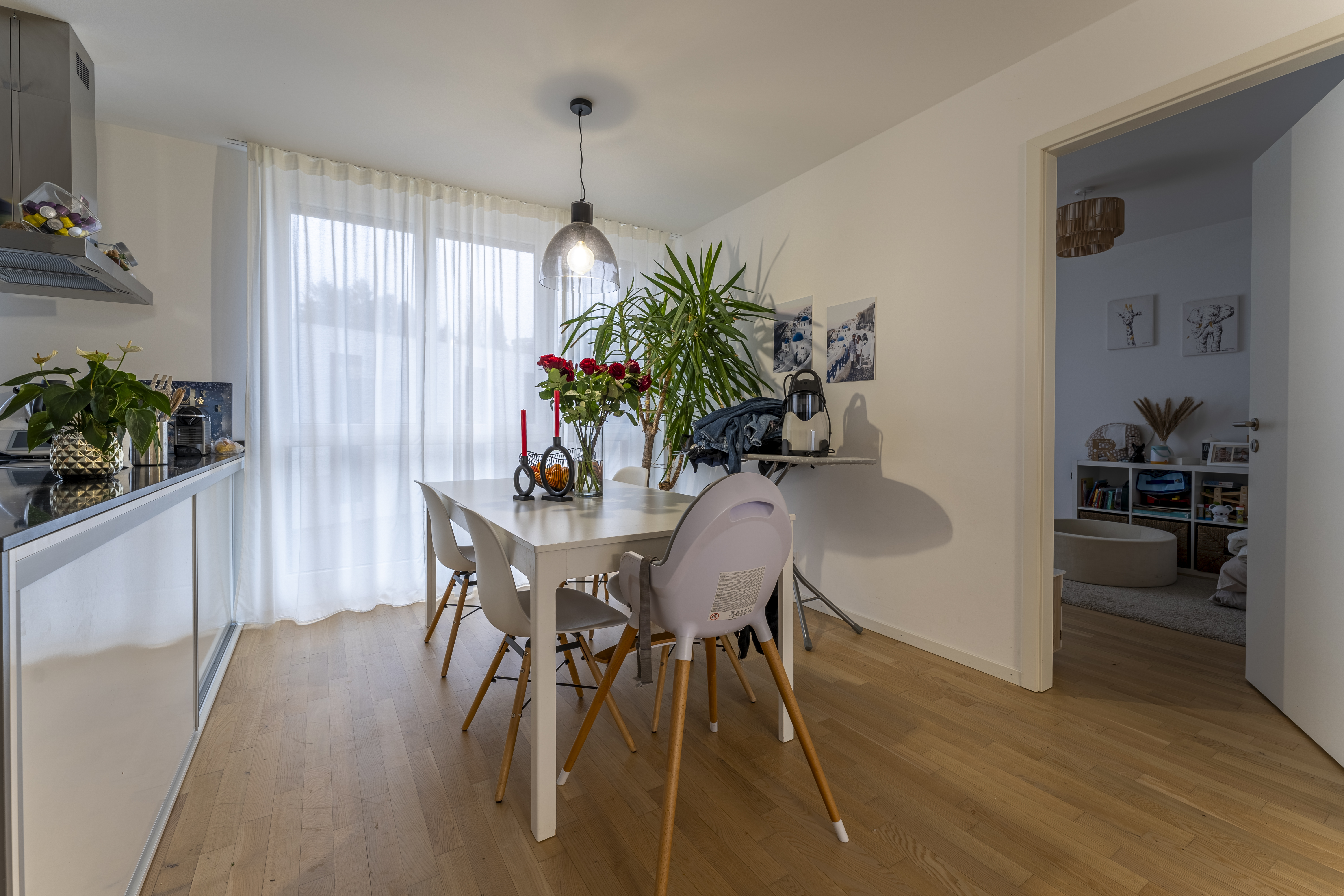 L'appartement se distribue sur un hall d'entrée menant à un grand espace séjour / salle à manger avec cuisine ouverte et accès au balcon via de grandes baies vitrées, deux chambres aux surfaces généreuses dont une avec salle de bain en suite, et une salle de bains supplémentaire avec espace pour colonne de lavage. En annexe, le bien dispose également d'une cave et d'une place de parc intérieure (en sus). Le bâtiment est certifié Minergie, équipé d'un ascenseur, d'un local à vélos et propose une grande place de jeux commune.