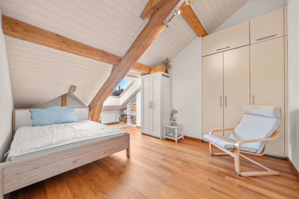 Les volumes généreux et la luminosité naturelle créent une atmosphère chaleureuse et contemporaine. Une mezzanine astucieusement aménagée offre un espace supplémentaire (env. 12m2 au sol) -- idéal pour un bureau, une chambre d'amis ou un espace de jeu.