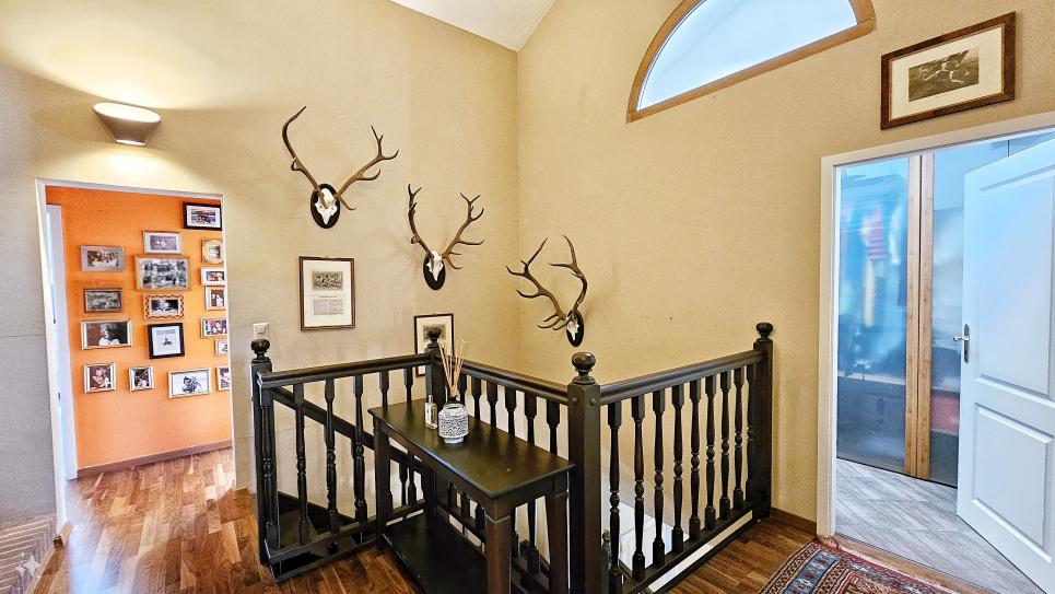 Vous découvrirez une grande entrée avec WC visiteurs, un vaste et lumineux séjour orné d'une cheminée à double foyer visible depuis la spacieuse cuisine et invitant à recevoir.