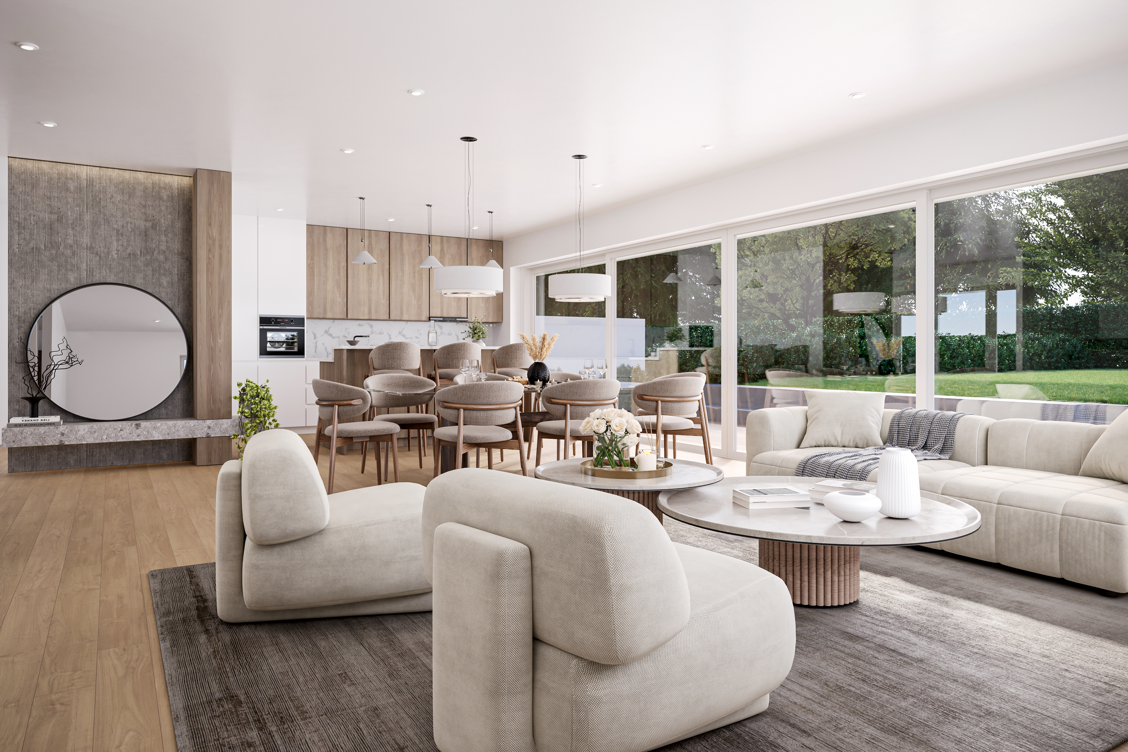 Rez-de-chaussée: Un hall d’entrée mène vers un vaste séjour, salle à manger et cuisine ouverte. Un bureau ainsi que des WC visiteurs complètent ce niveau.