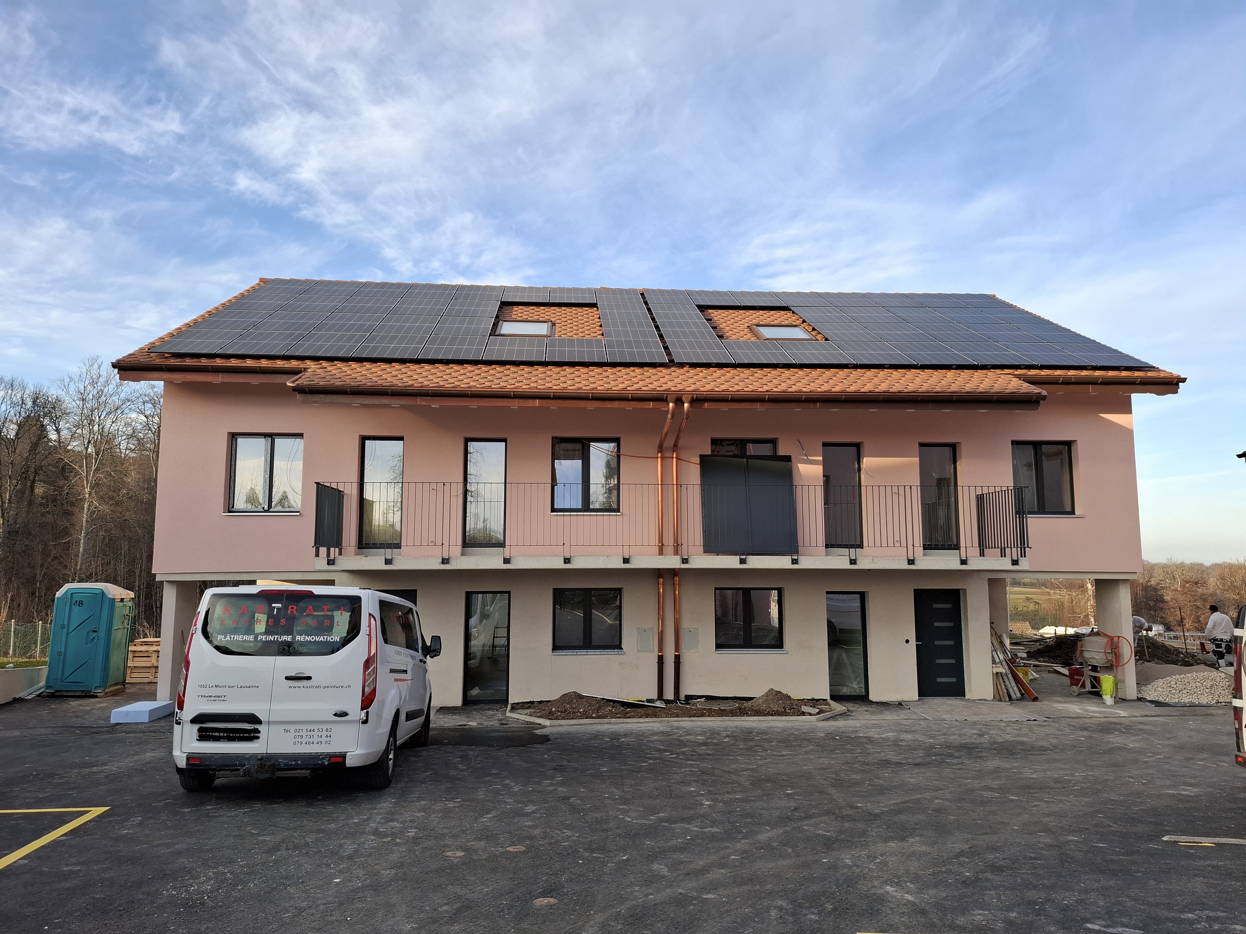 Construite selon les normes énergétiques les plus exigeantes, la maison est équipée d’une pompe à chaleur air-eau, d’un chauffage au sol et d’une installation solaire, garantissant un excellent confort thermique et des économies d’énergie durables.