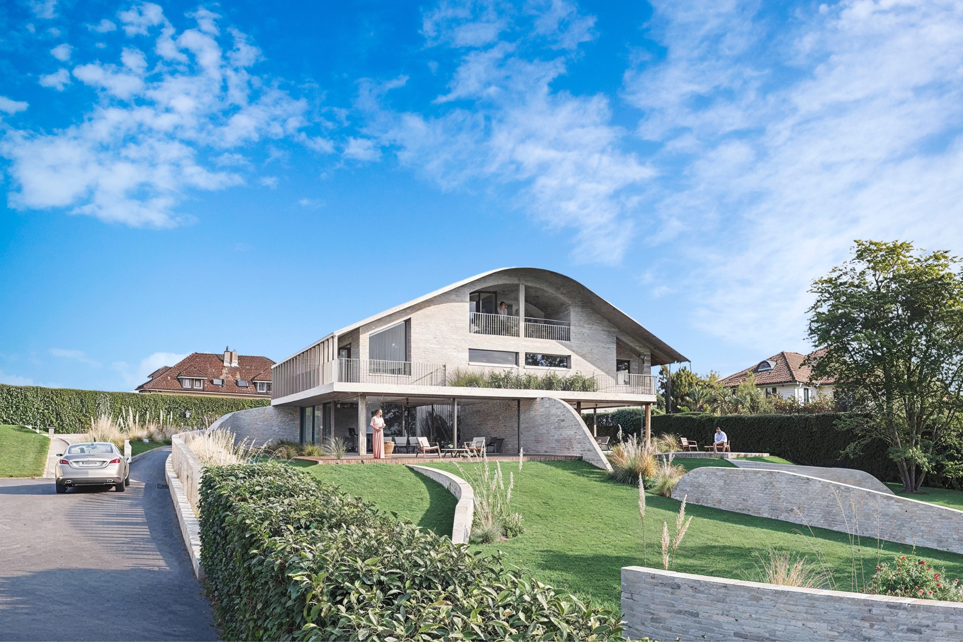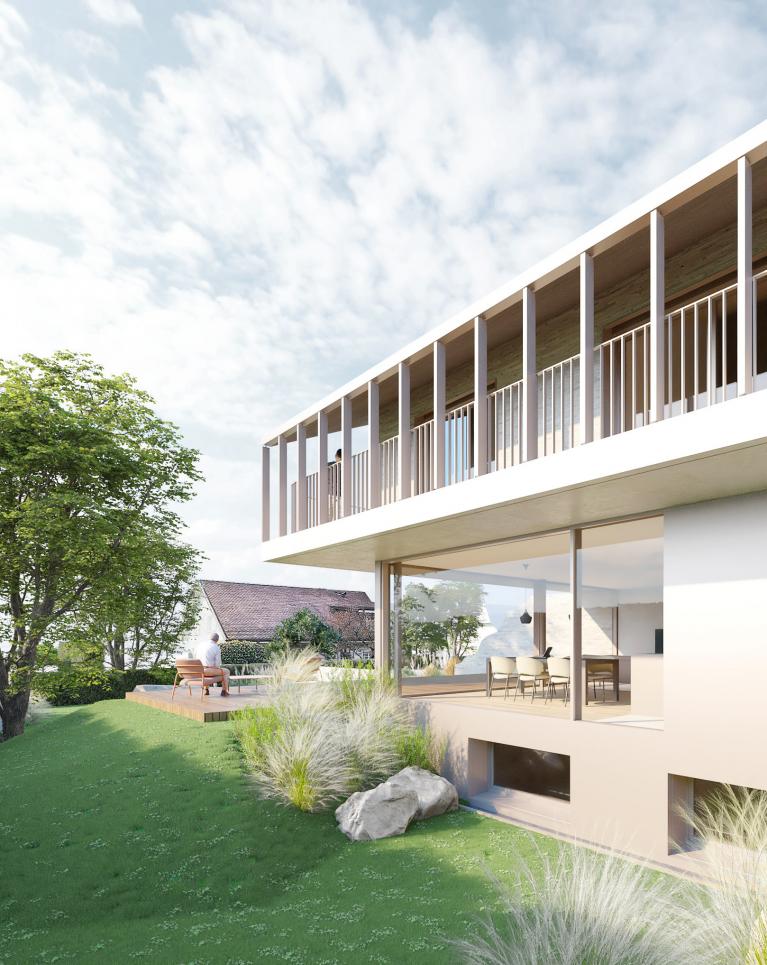 Le projet se divise harmonieusement en deux villas résidentielles. La façade principale, exposée plein sud, est un véritable écrin de lumière tout au long de la journée. Les étages supérieurs, quant à eux, bénéficient d'une perspective privilégiée, offrant une vue dégagée sur le lac Léman.